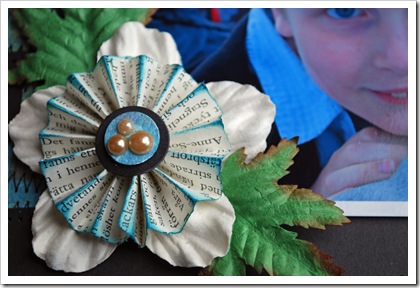 Mitt första DT-kit innehöll bl a mönstrade papper från Teresa Collins, Travel Ledger, vita Primablommor och wellpapp. Teresa Collins-papperna är otroligt vackra, härliga i strukturen och med läckra mönster. Det behövs inte så mycket dekorationer för att få ett arbetat intryck. Jag har skapat en layout om min son och hur lätt han skapar kompisar – det behövs bara en boll och ett mål :). De röda detaljerna i Teresa Collins-papperna plockade jag upp med en vacker Primablomma, Love Story Kissing Red.